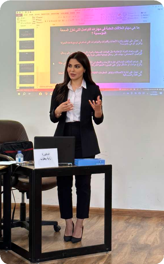 Raya Yacoub is a seasoned media consultant and university lecturer with over 15 years of experience in the Arab and local media industry and teaching at the Middle East University, she specializes in courses such as “Visual and Audio Presentation,” “Media Issues,” “Program Preparation and Production,” “Digital Content Creation,” and “Journalism Reporting,” all delivered in English. Raya is also a certified trainer in communication skills, content creation, and digital management, and focuses on designing and executing communication strategies tailored for various media channels. Her expertise extends to public speaking and digital transformation within media landscapes.